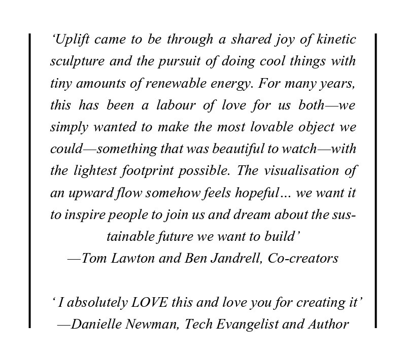 Hand assembled and finished just for you by creators Tom & Ben — and friends. Uplift stands at around 12 inches tall. Carefully packaged and delivered anywhere in the world in early summer for the first 500 units. Pricing will be subject to shipping charges.