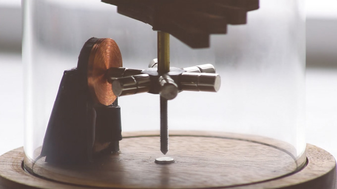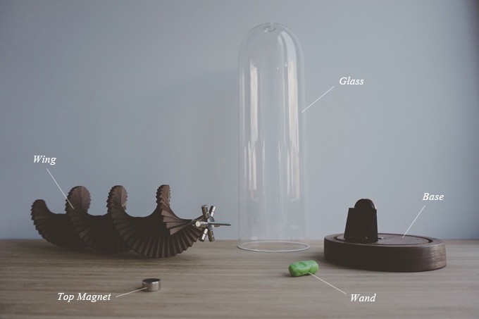 The wing is suspended at the top through the glass dome by a magnet while hovering at the base, providing an exquisite, efficient and finely tuned solar powered kinetic sculpture.